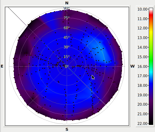 - Sky brightness reported in visual magnitudes per square arcsecond.